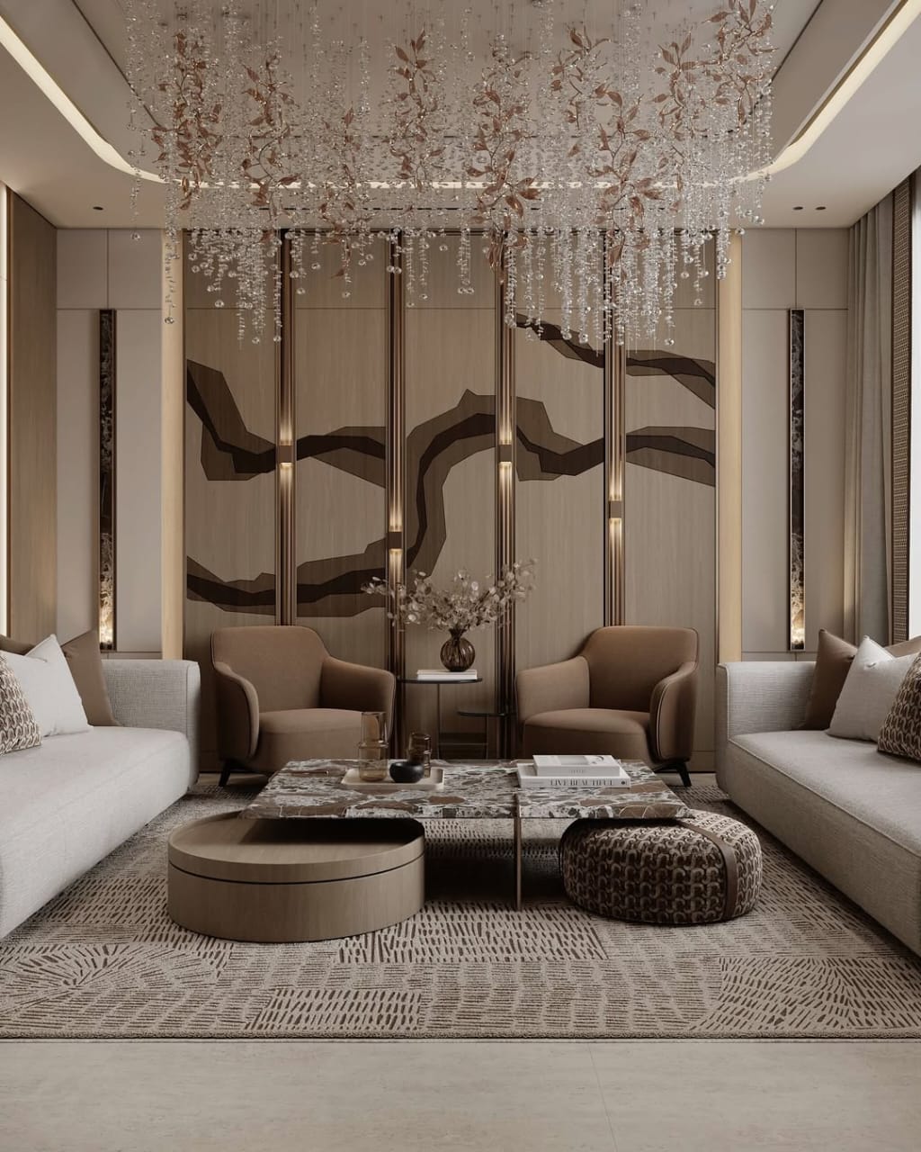 Living room interiors by a studio like Design Doves in Noida are typically styled as upscale, glamorous spaces that blend modern contemporary furniture with rich materials and curated decor.​ Style and Concept Design Doves describes its work as bringing fashion-house glamour and luxury into everyday living, including villas, bungalows, penthouses and apartments. Their interiors meld colour, sophistication and a blend of Indian, French and modern contemporary furniture, giving living rooms a cosmopolitan, “soulful” vibe rather than a purely minimalist look.​ Typical Living Room Features For a living room, this approach usually means: Statement sofas and accent chairs with tailored upholstery and refined silhouettes.​ Layered materials such as stone, glass, metal work, rugs, fabrics, trims and wall coverings to create depth and a luxurious feel.​ Carefully selected lighting (chandeliers, wall lights, floor lamps) that adds both drama and warmth to the seating area.​ Planning and Customisation Design Doves describes its projects as “bespoke” interiors, meaning layouts, furniture selection and decor in the living room are planned around the client’s lifestyle and preferences. As a turnkey interior design and manufacturing studio, they can design, build and supply custom furniture and decor elements so the living room reads as a cohesive, tailored space.​ If you share your room size, preferences (modern/classic, light/dark, budget), a living room description can be written specifically for your home in the Design Doves style.